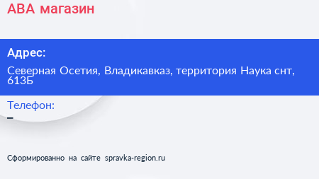 АВА, магазин по адресу Северная Осетия, Владикавказ, территория Наука снт, 613Б в дальнейшем Организация, размещена в следующих категориях:
