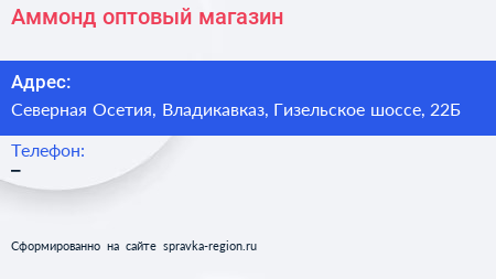 Аммонд, оптовый магазин по адресу Северная Осетия, Владикавказ, Гизельское шоссе, 22Б в дальнейшем Организация, размещена в следующих категориях:
