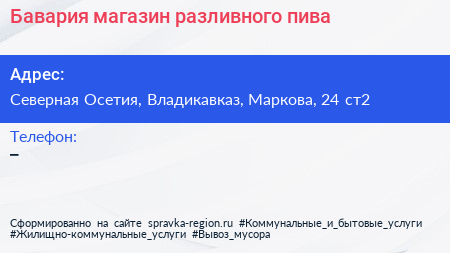 Бавария, магазин разливного пива по адресу Северная Осетия, Владикавказ, Маркова, 24 ст2 в дальнейшем Организация, размещена в следующих категориях: