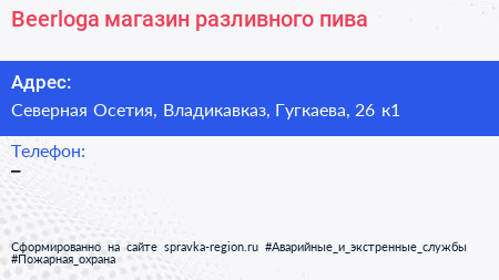 Beerloga, магазин разливного пива по адресу Северная Осетия, Владикавказ, Гугкаева, 26 к1 в дальнейшем Организация, размещена в следующих категориях: