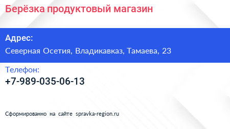 Берёзка, продуктовый магазин по адресу Северная Осетия, Владикавказ, Тамаева, 23 в дальнейшем Организация, размещена в следующих категориях:
