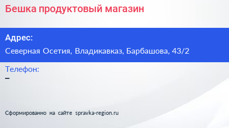 Бешка, продуктовый магазин по адресу Северная Осетия, Владикавказ, Барбашова, 43/2 в дальнейшем Организация, размещена в следующих категориях: