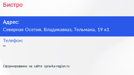 Бистро по адресу Северная Осетия, Владикавказ, Тельмана, 19 к1 в дальнейшем Организация, размещена в следующих категориях: