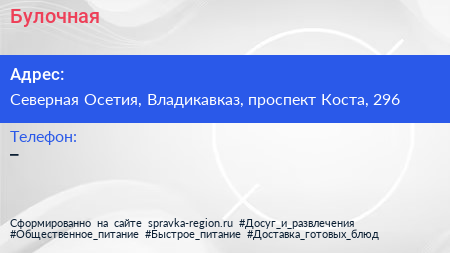 Булочная по адресу Северная Осетия, Владикавказ, проспект Коста, 296 в дальнейшем Организация, размещена в следующих категориях: