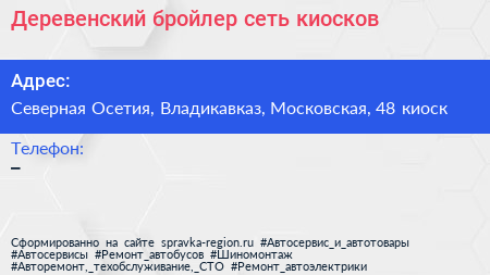 Деревенский бройлер, сеть киосков по адресу Северная Осетия, Владикавказ, Московская, 48 киоск в дальнейшем Организация, размещена в следующих категориях:
