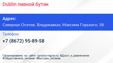 Dublin, пивной бутик по адресу Северная Осетия, Владикавказ, Максима Горького, 58 в дальнейшем Организация, размещена в следующих категориях: