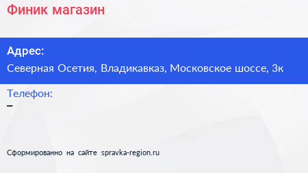 Финик, магазин по адресу Северная Осетия, Владикавказ, Московское шоссе, 3к в дальнейшем Организация, размещена в следующих категориях: