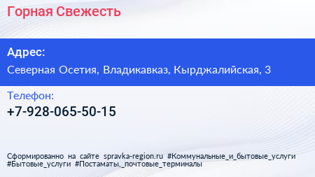 Горная Свежесть по адресу Северная Осетия, Владикавказ, Кырджалийская, 3 в дальнейшем Организация, размещена в следующих категориях:
