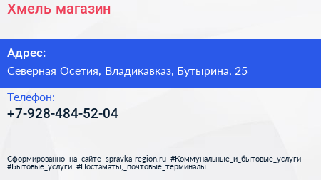 Хмель, магазин по адресу Северная Осетия, Владикавказ, Бутырина, 25 в дальнейшем Организация, размещена в следующих категориях: