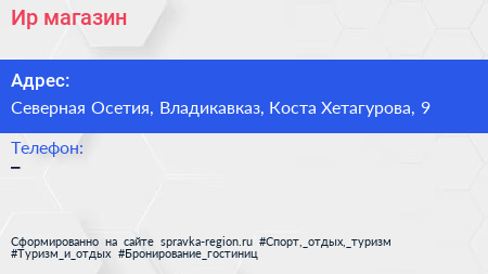 Ир, магазин по адресу Северная Осетия, Владикавказ, Коста Хетагурова, 9 в дальнейшем Организация, размещена в следующих категориях: