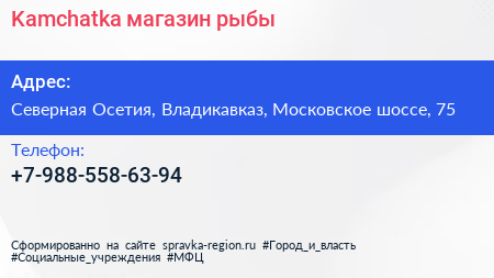 Kamchatka, магазин рыбы по адресу Северная Осетия, Владикавказ, Московское шоссе, 75 в дальнейшем Организация, размещена в следующих категориях: