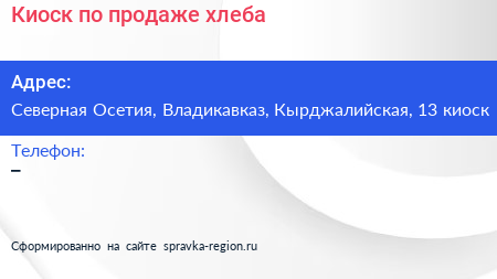 Киоск по продаже хлеба по адресу Северная Осетия, Владикавказ, Кырджалийская, 13 киоск в дальнейшем Организация, размещена в следующих категориях: