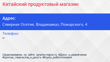 Китайский, продуктовый магазин по адресу Северная Осетия, Владикавказ, Пожарского, 4 в дальнейшем Организация, размещена в следующих категориях: