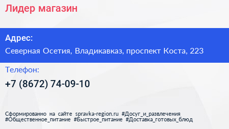 Лидер, магазин по адресу Северная Осетия, Владикавказ, проспект Коста, 223 в дальнейшем Организация, размещена в следующих категориях: