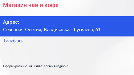 Магазин чая и кофе по адресу Северная Осетия, Владикавказ, Гугкаева, 61 в дальнейшем Организация, размещена в следующих категориях: