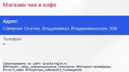 Магазин чая и кофе по адресу Северная Осетия, Владикавказ, Владикавказская, 30Б в дальнейшем Организация, размещена в следующих категориях: