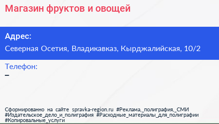 Магазин фруктов и овощей по адресу Северная Осетия, Владикавказ, Кырджалийская, 10/2 в дальнейшем Организация, размещена в следующих категориях: