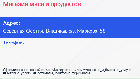 Магазин мяса и продуктов по адресу Северная Осетия, Владикавказ, Маркова, 58 в дальнейшем Организация, размещена в следующих категориях: