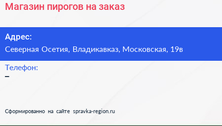 Магазин пирогов на заказ по адресу Северная Осетия, Владикавказ, Московская, 19в в дальнейшем Организация, размещена в следующих категориях: