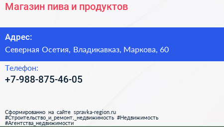 Магазин пива и продуктов по адресу Северная Осетия, Владикавказ, Маркова, 60 в дальнейшем Организация, размещена в следующих категориях:
