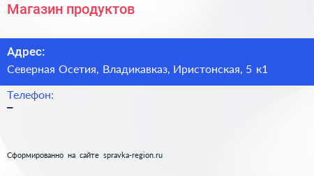 Магазин продуктов по адресу Северная Осетия, Владикавказ, Иристонская, 5 к1 в дальнейшем Организация, размещена в следующих категориях: