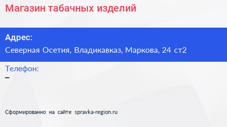 Магазин табачных изделий по адресу Северная Осетия, Владикавказ, Маркова, 24 ст2 в дальнейшем Организация, размещена в следующих категориях: