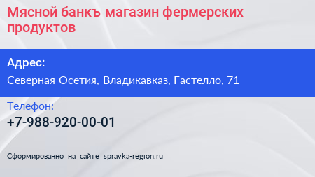 Мясной банкъ, магазин фермерских продуктов по адресу Северная Осетия, Владикавказ, Гастелло, 71 в дальнейшем Организация, размещена в следующих категориях: