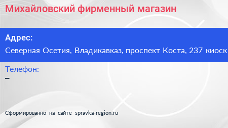 Михайловский, фирменный магазин по адресу Северная Осетия, Владикавказ, проспект Коста, 237 киоск в дальнейшем Организация, размещена в следующих категориях: