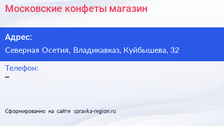 Московские конфеты, магазин по адресу Северная Осетия, Владикавказ, Куйбышева, 32 в дальнейшем Организация, размещена в следующих категориях: