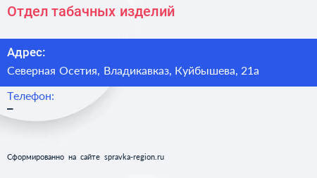 Отдел табачных изделий по адресу Северная Осетия, Владикавказ, Куйбышева, 21а в дальнейшем Организация, размещена в следующих категориях:
