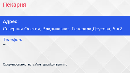 Пекарня по адресу Северная Осетия, Владикавказ, Генерала Дзусова, 5 к2 в дальнейшем Организация, размещена в следующих категориях: