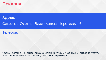 Пекарня по адресу Северная Осетия, Владикавказ, Церетели, 19 в дальнейшем Организация, размещена в следующих категориях: