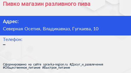 Пивко, магазин разливного пива по адресу Северная Осетия, Владикавказ, Гугкаева, 10 в дальнейшем Организация, размещена в следующих категориях: