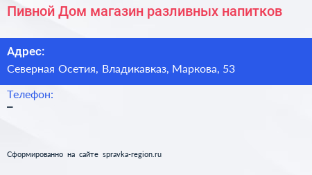 Пивной Дом, магазин разливных напитков по адресу Северная Осетия, Владикавказ, Маркова, 53 в дальнейшем Организация, размещена в следующих категориях: