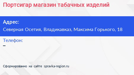Портсигар, магазин табачных изделий по адресу Северная Осетия, Владикавказ, Максима Горького, 18 в дальнейшем Организация, размещена в следующих категориях: