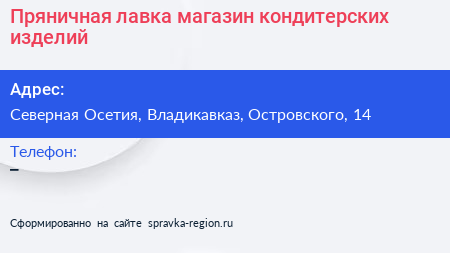 Пряничная лавка, магазин кондитерских изделий по адресу Северная Осетия, Владикавказ, Островского, 14 в дальнейшем Организация, размещена в следующих категориях: