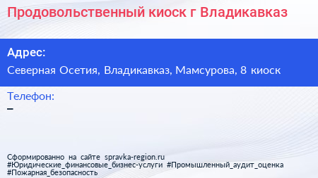 Продовольственный киоск, г. Владикавказ по адресу Северная Осетия, Владикавказ, Мамсурова, 8 киоск в дальнейшем Организация, размещена в следующих категориях: