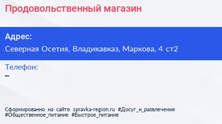 Продовольственный магазин по адресу Северная Осетия, Владикавказ, Маркова, 4 ст2 в дальнейшем Организация, размещена в следующих категориях: