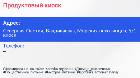 Продуктовый киоск по адресу Северная Осетия, Владикавказ, Морских пехотинцев, 5/1 киоск в дальнейшем Организация, размещена в следующих категориях: