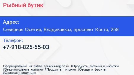 Рыбный бутик по адресу Северная Осетия, Владикавказ, проспект Коста, 258 в дальнейшем Организация, размещена в следующих категориях: