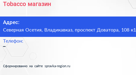 Tobacco, магазин по адресу Северная Осетия, Владикавказ, проспект Доватора, 108 к1 в дальнейшем Организация, размещена в следующих категориях: