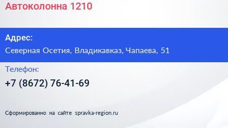 Автоколонна №1210 по адресу Северная Осетия, Владикавказ, Чапаева, 51 в дальнейшем Организация, размещена в следующих категориях: