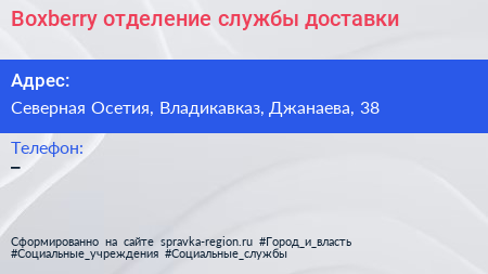 Boxberry, отделение службы доставки по адресу Северная Осетия, Владикавказ, Джанаева, 38 в дальнейшем Организация, размещена в следующих категориях: