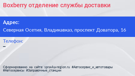 Boxberry, отделение службы доставки по адресу Северная Осетия, Владикавказ, проспект Доватора, 16 в дальнейшем Организация, размещена в следующих категориях: