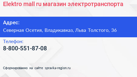 Elektro-mall.ru, магазин электротранспорта по адресу Северная Осетия, Владикавказ, Льва Толстого, 36 в дальнейшем Организация, размещена в следующих категориях: