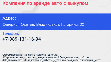 Компания по аренде авто с выкупом по адресу Северная Осетия, Владикавказ, Гагарина, 30 в дальнейшем Организация, размещена в следующих категориях: