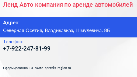 Ленд Авто, компания по аренде автомобилей по адресу Северная Осетия, Владикавказ, Шмулевича, 8Б в дальнейшем Организация, размещена в следующих категориях: