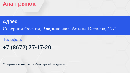 Алан, рынок по адресу Северная Осетия, Владикавказ, Астана Кесаева, 12/1 в дальнейшем Организация, размещена в следующих категориях: