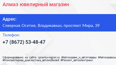 Алмаз, ювелирный магазин по адресу Северная Осетия, Владикавказ, проспект Мира, 39 в дальнейшем Организация, размещена в следующих категориях: