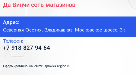 Да Винчи, сеть магазинов по адресу Северная Осетия, Владикавказ, Московское шоссе, 3к в дальнейшем Организация, размещена в следующих категориях: